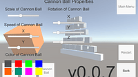 Update 0.0.7 Alpha - Added changing cannon ball color Colors: Gray, Red, Green, Blue, Orange, Cyan, Magenta, Yellow - Added changing speed in X and Y values of the cannon ball - Added changing the rot...